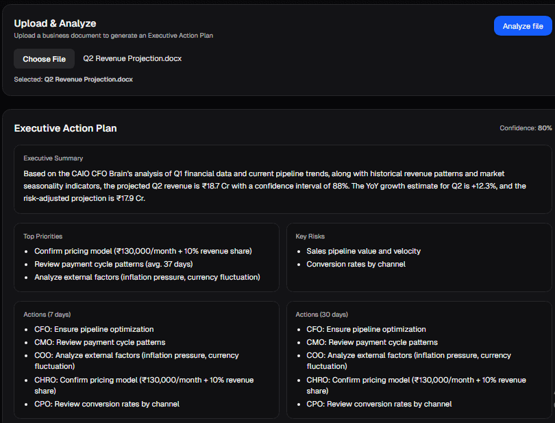 Upload any business document and get a full Executive Action Plan with priorities, risks, and department-specific actions.
